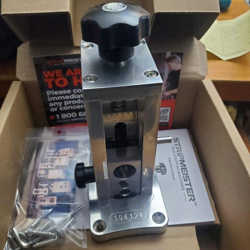 This model is ideal for users who want a dependable machine that gets the job done without the size, weight, or cost of an electric unit. With a working range from 18 AWG to 250 MCM and a compact footprint that fits any bench, the StripMeister Original remains a proven choice for everyday tasks.